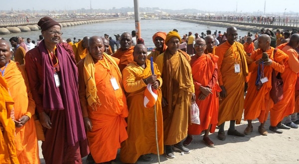 महाकुंभ नगर दुनिया के कई देशों के भंते, लामा व बौद्ध भिक्षुओं ने गुरुवार को प्रयागराज संगम में आस्था की डुबकी लगाकर दुनिया को सनातन की एकता का संदेश दिया। "बुद्ध शरणं गच्छामि, धम्मं शरणम् गच्छामि, संघं शरणं गच्छामि" का उदघोष करते हुए 500 से अधिक बौद्ध भिक्षु संगम तट पर पहुंचकर डुबकी लगाई। भगवान बुद्ध की करूणा हो, सम्राट अशोक अमर रहें के नारे से संगम तट गूंज उठा। संगम में डुबकी लगाने के बाद बौद्ध भिक्षु सनातन के प्रति गर्व की अनुभूति कर रहे थे। राष्ट्रीय स्वयंसेवक संघ के अखिल भारतीय कार्यकारिणी के सदस्य इन्द्रेश कुमार की उपस्थिति में कई देशों के बौद्ध भिक्षुओं ने सनातन व बौद्ध एकता का संकल्प लिया।