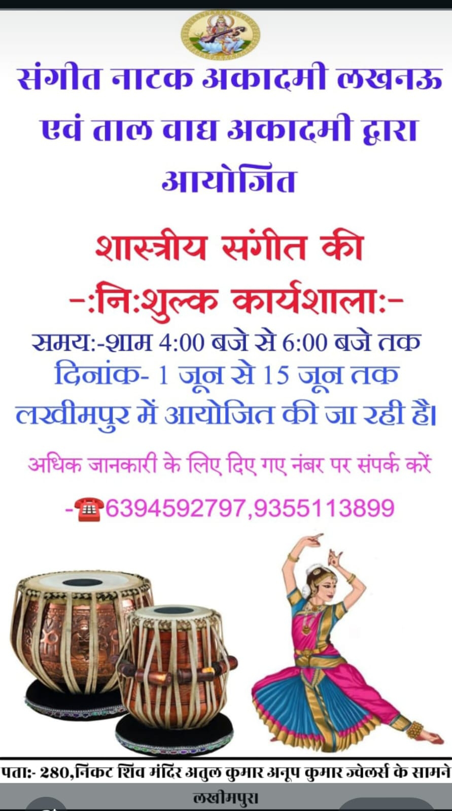 उल्लेखनीय है कि 1 जून से 15 जून तक, संगीत नाटक अकादमी लखनऊ तथा ताल वाद्य अकादमी के सौजन्य से लखीमपुर की पावन धरती पर शास्त्रीय संगीत की एक नि:शुल्क कार्यशाला का आयोजन किया जा रहा है। यहां प्रत्येक संध्या 4:00 से 6:00 बजे तक, सुर और ताल का अद्वितीय संगम होगाbजहाँ कला केवल सीखी नहीं जाएगी, बल्कि जी जाएगी। यह कार्यशाला केवल संगीत की शिक्षा नहीं देगी, बल्कि आत्मा को स्वरबद्ध करने की एक आध्यात्मिक यात्रा होगी। तबले की थाप, भरतनाट्यम की मुद्राएँ, और रागों की सुगंध, सब मिलकर रचेंगे एक ऐसा वातावरण, जहाँ मन संगीत में तिरोहित हो जाएगा।